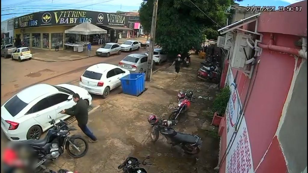 Imagens de câmera de segurança flagraram o momento em que a vítima foi assassinada na quinta-feira (27). No vídeo é possível ver dois homens chegando de moto enquanto a vítima, de camisa vermelha, estaciona a motociclista. Os suspeitos começam a falar com Francisco e logo depois um dos homens inicia a briga, pega a arma e atira várias vezes.