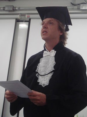 Vinny discursa em sua formatura em Filosofia; ele foi o orador da turma